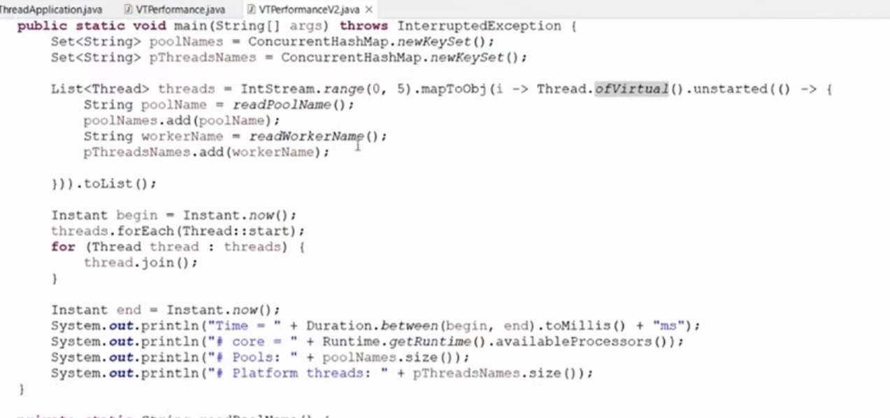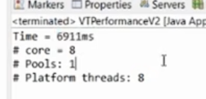 该代码基本上启动了五个虚拟线程,然后使用一些代码提取池名称和平台线程名称。最后,它只是打印不同的统计信息、运行此代码所需的时间、CPU 上的核心数量、线程池数量,以及平台线程的数量。