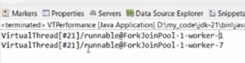 这个ForkJoinPool的线程7,当它从睡眠状态回来时,它并没有继续运行在原来的平台线程上,而是跳转到了另外一个平台线程。如果您在自己的计算机上执行此操作,请确保启动足够的虚拟线程,因为您可能不会仅使用一两个线程来观察到这一点。