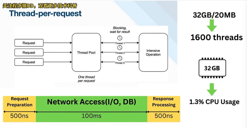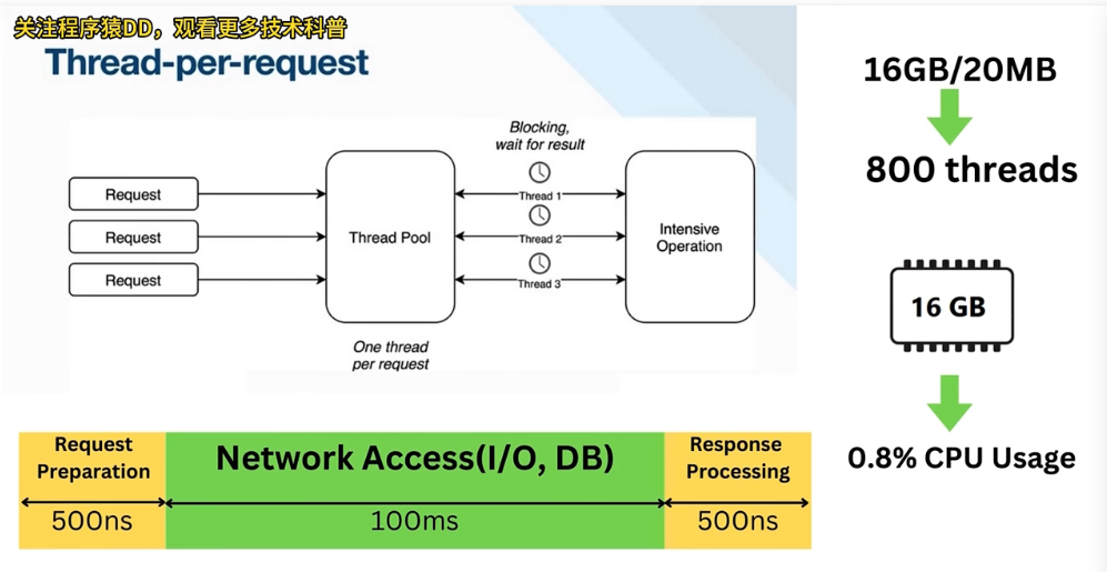 假设您的应用程序有 16 GB 的可用内存。除以 20 MB 的线程大小,这样的机器上就有 800 个线程的空间。假设这些线程正在执行一些 I/O,就像访问网络上的资源一样。假设该资源在 100 毫秒内被访问。准备请求和处理响应将在 10 纳秒的时间内完成。假设所有这些内存计算需要 1000 纳秒。这意味着在准备请求和处理响应之间存在一个大约 100000 的因素,以及获得响应所需的时间,在此期间您的线程就在那里什么都不做。所以如果你有 800 个这样的线程,那么CPU利用率只有可怜的0.8%。