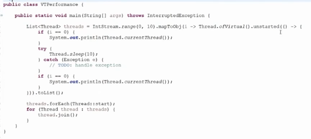 这段代码中,使用了流模式创建 10 个虚拟的、未启动的线程。这些线程正在运行的任务只是打印当前线程。然后,让它们休眠 10 毫秒,接着再次打印线程的名称。最后,启动这些未启动的线程并调用 join 方法以确保所有内容都可以在控制台上看到。