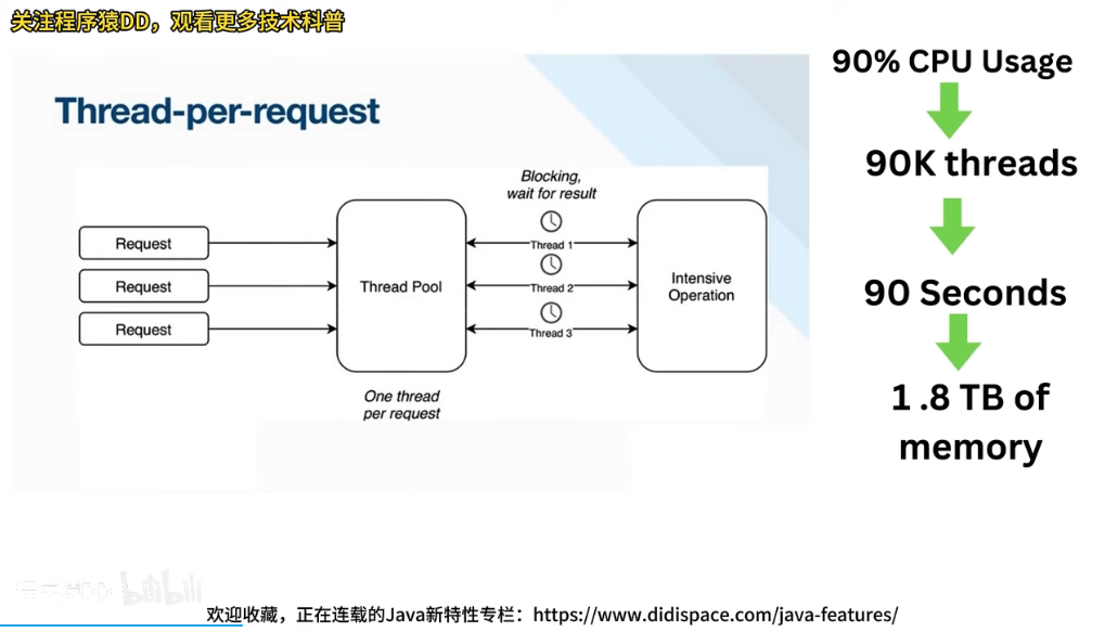 反过来思考下,如果我们希望达到90%的CPU利用率。那么就需要 90000 个线程,启动它们需要 90秒,同时,还要消耗 1.8 TB 的内存。