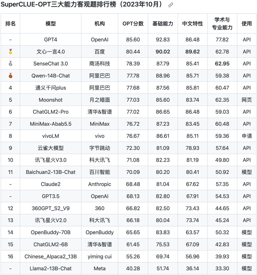 注:本次评测的GPT3.5版本为gpt-3.5-turbo-16k;文心一言4.0和SenseChat3.0由于分数非常接近(在0.05分以内)认定为并列。