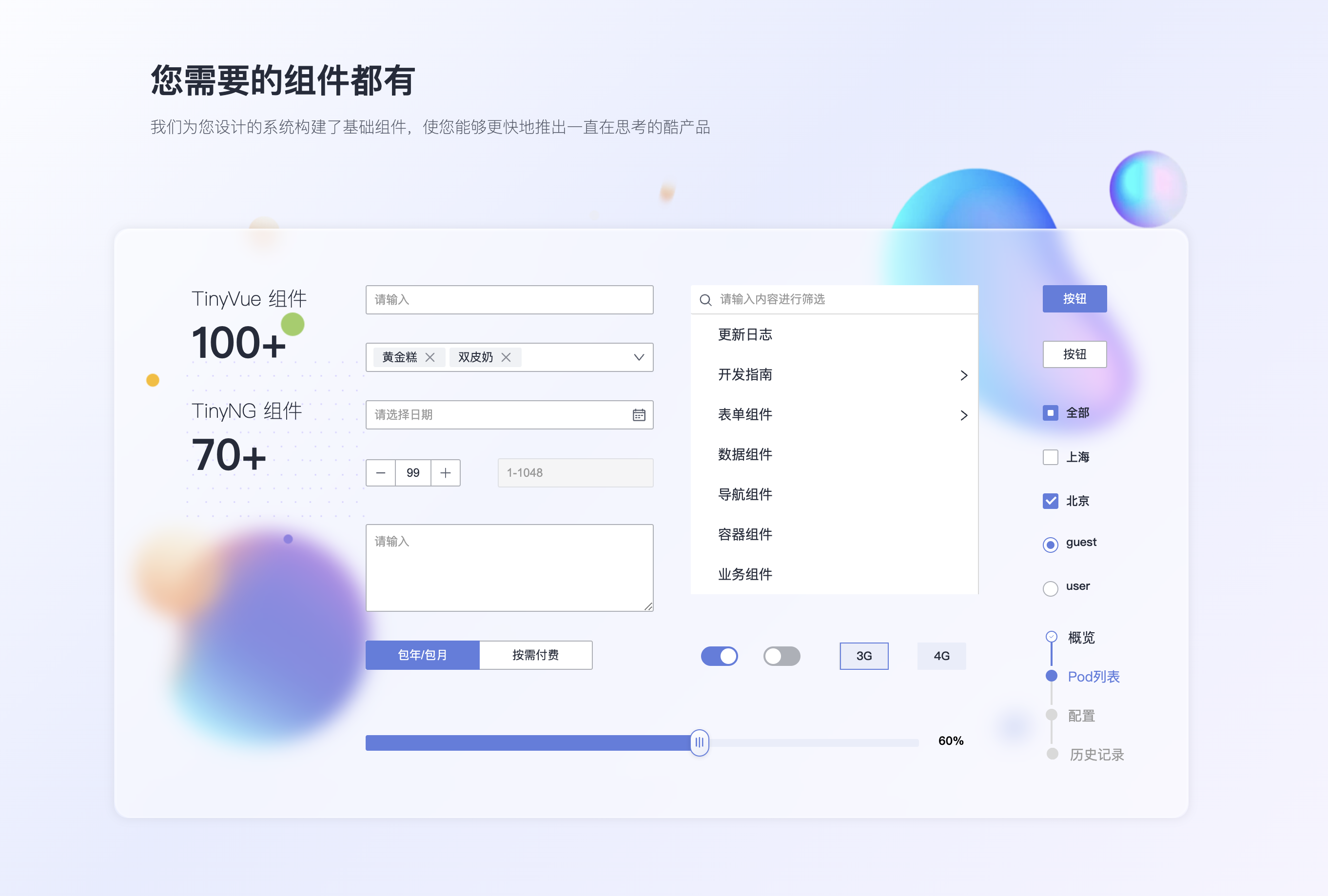 跨端跨框架:使用 Renderless 无渲染组件设计架构,实现了一套代码同时支持 Vue2 / Vue3,PC / Mobile 端,并支持函数级别的逻辑定制和全模板替换,灵活性好、二次开发能力强。组件丰富:PC端有100+组件,移动端有30+组件,包含高频组件 Table、Tree、Select 等,内置虚拟滚动,保证大数据场景下的流畅体验,除了业界常见组件之外,我们还提供了一些独有的特色组件,如:Split 面板分割器、IpAddress IP 地址输入框、Calendar 日历、Crop 图片裁切等。低代码引擎:TinyEngine 低代码引擎使能开发者定制低代码平台。它是低代码平台的底座,提供可视化搭建页面等基础能力,既可以通过线上搭配组合,也可以通过下载源码进行二次开发,实时定制出自己的低代码平台。适用于多场景的低代码平台开发,如:资源编排、服务端渲染、模型驱动、移动端、大屏端、页面编排等。配置式组件:组件支持模板式和配置式两种使用方式,适合低代码平台,目前团队已经将 OpenTiny 集成到内部的低代码平台,针对低码平台做了大量优化周边生态齐全:提供了基于 Angular + TypeScript 的 TinyNG 组件库,提供包含 10+ 实用功能、20+ 典型页面的 TinyPro 中后台模板,提供覆盖前端开发全流程的 TinyCLI 工程化工具,提供强大的在线主题配置平台 TinyTheme