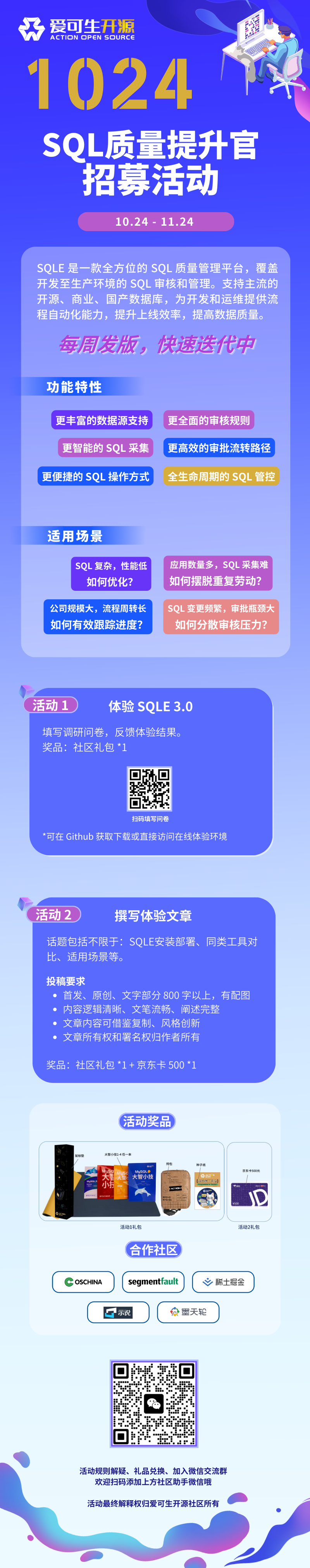 为了感谢广大社区成员对 SQLE 的关注、使用和贡献,社区特别企划 1024 特别企划 | SQL 质量提升官招募活动,快来留下您的使用体验!