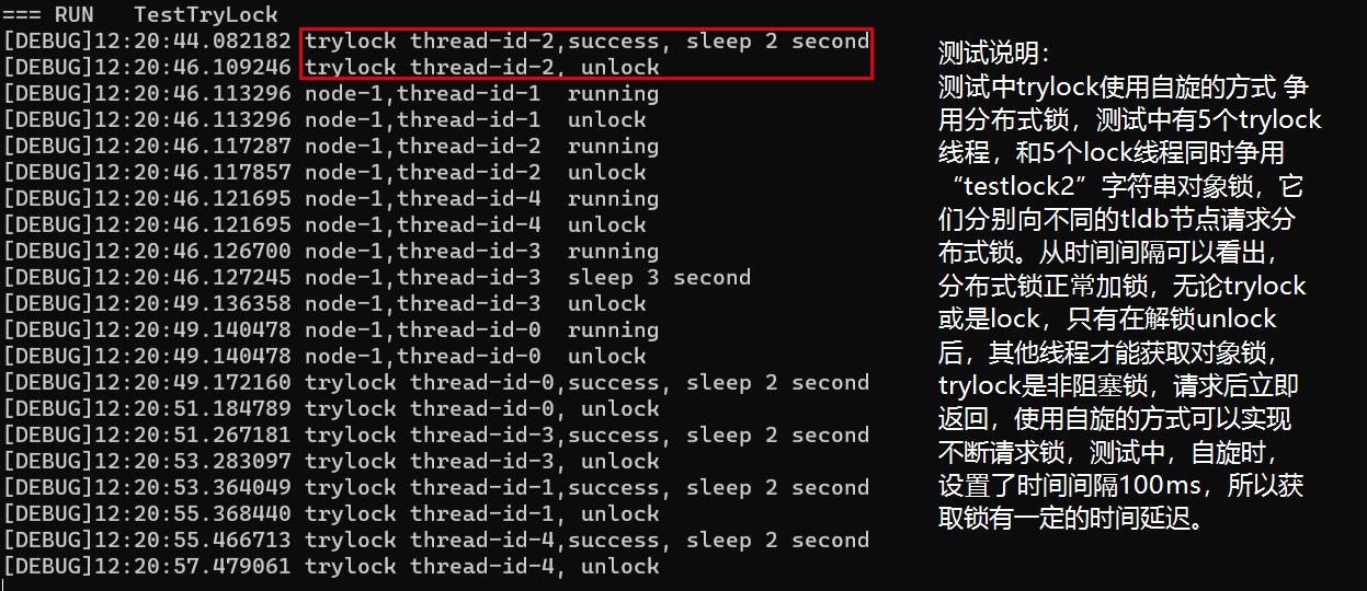 以下是tldb分布式锁的功能测试数据: 多线程并发 调用lock获取同一个对象锁后,程序的运行数据: