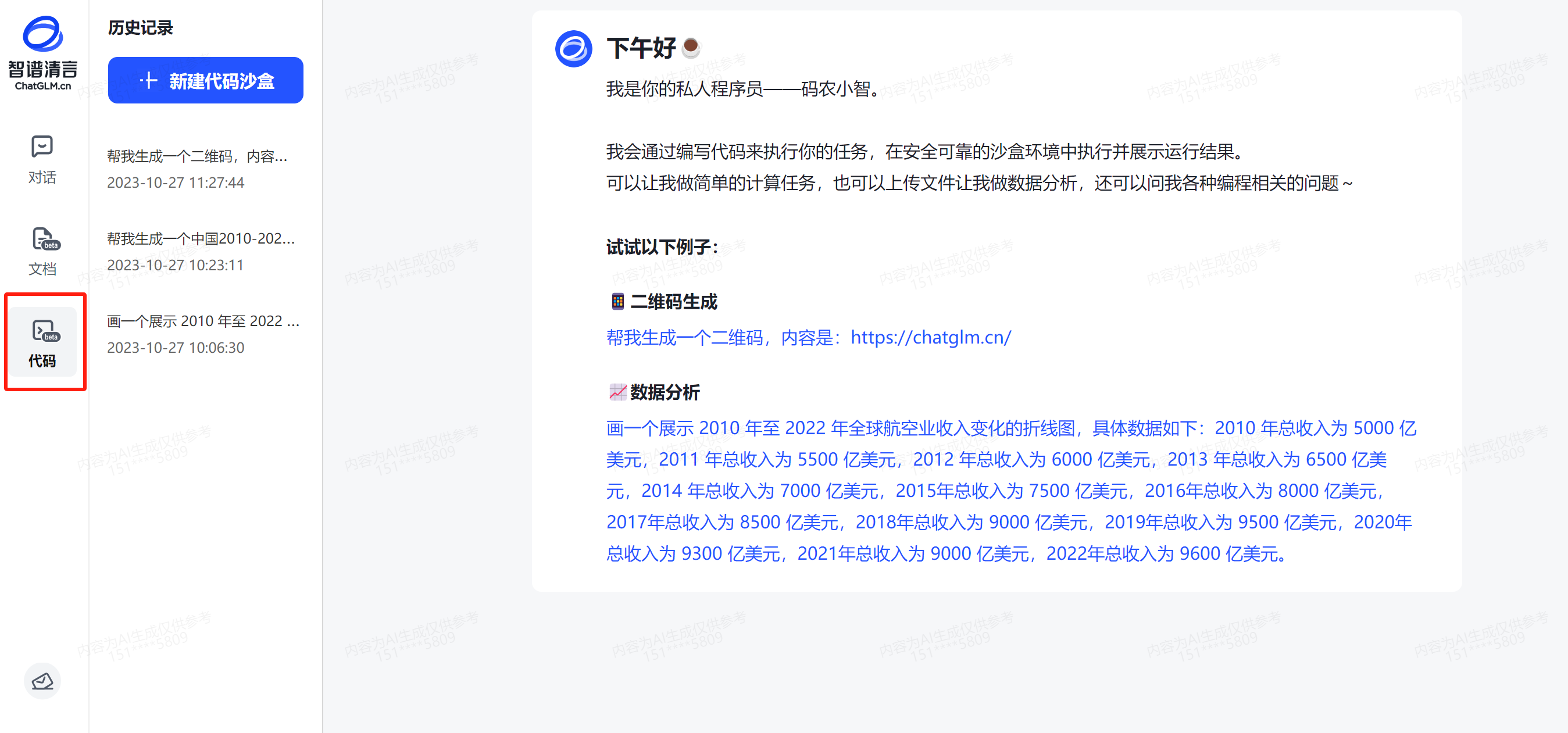 在全新升级的ChatGLM3赋能下,生成式AI助手智谱清言已成为国内首个具备代码交互能力的大模型产品(Code Interpreter)。