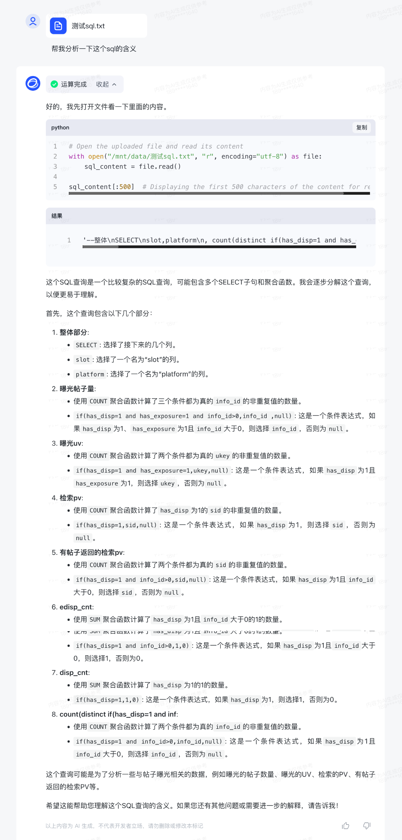 代码增强模块Code Interpreter根据用户需求生成代码并执行,自动完成数据分析、文件处理等复杂任务;