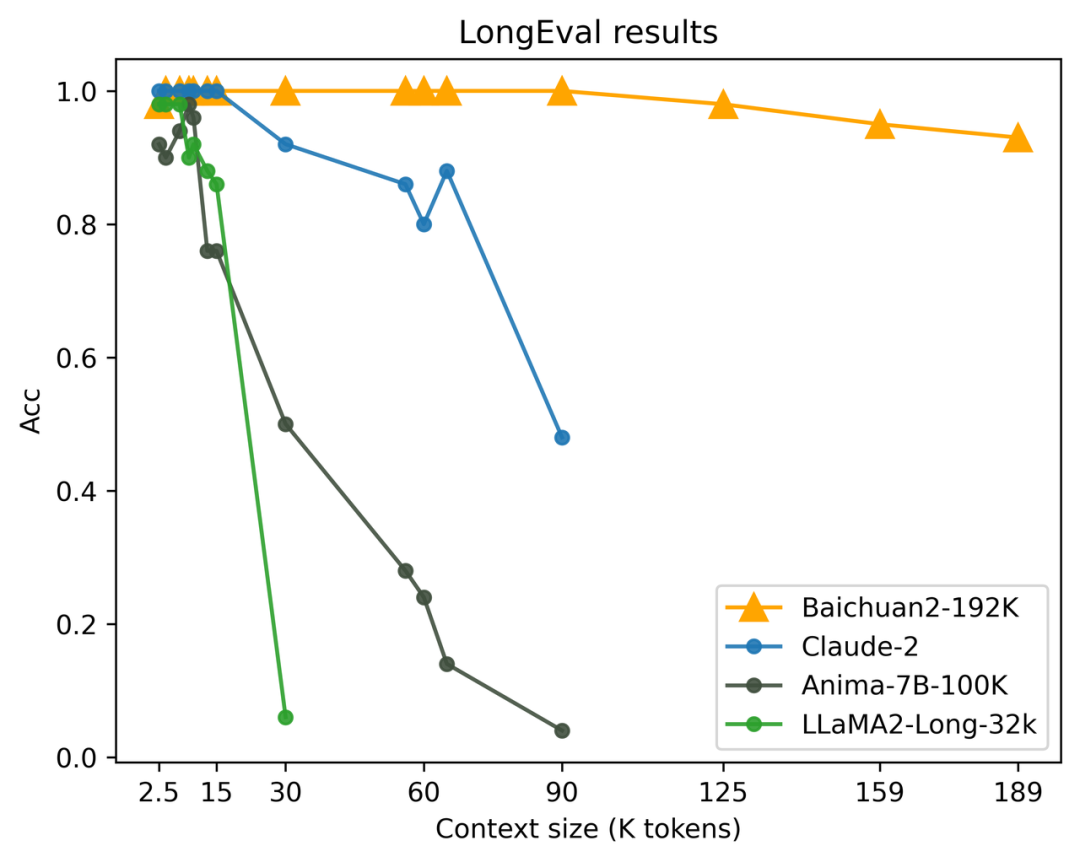 此外,LongEval的评测结果显示,在窗口长度超过100K后Baichuan2-192K依然能够保持非常强劲的性能,而其他开源或者商用模型在窗口长度增长后效果都出现了近乎直线下降的情况。Claude2也不例外,在窗口长度超过80K后整体效果下降非常严重。