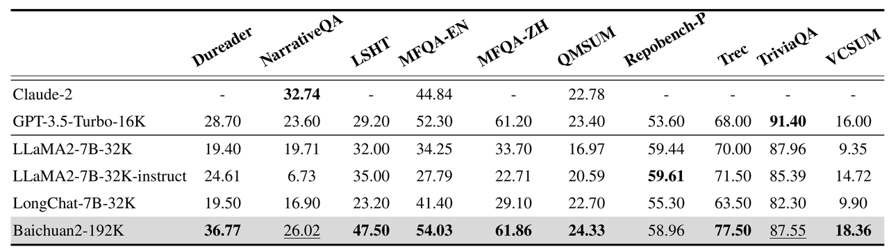 Baichuan2-192K在Dureader、NarrativeQA、LSHT、TriviaQA等10项中英文长文本问答、摘要的评测集上表现优异,有7项取得SOTA,显著超过其他长窗口模型。