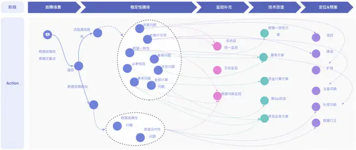 代码中的问题都定位到了,有些需要进行技术改造,对应不同的问题你的技术方案都考虑全了么?顺着这个问题,我整理了一张图稳定性摸排全链路(摸排->监控补充->技术改造->预案)的Action路由图,希望可以使团队同学在稳定性建设过程中有个体系化的指导。