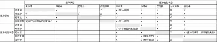 由于付款单据与付款凭证(账单)之间的状态流转有依赖关系,俩个单据自身的状态流转也有卡口规则,所以在实操过程中我们列了一个状态机列表,辅助数据对账准确无遗漏的落地。这个图非必选,但如果摸排的业务中同样有复杂的业务单据状态流转的依赖关系,建议画出此图辅助监控的添加。