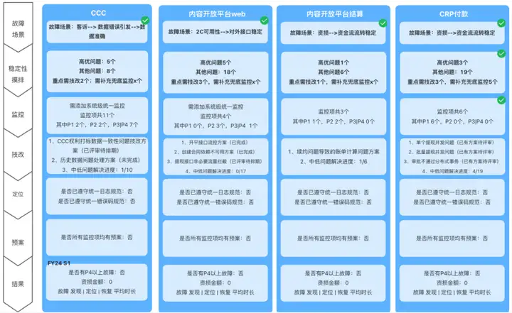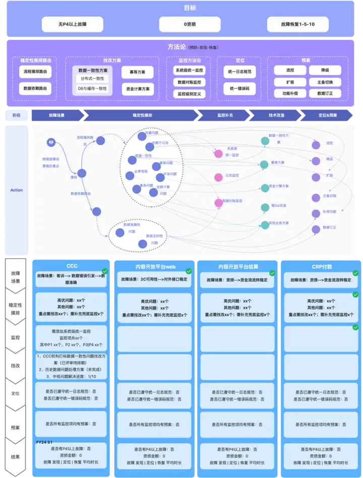 在之前写了篇文章《上线十年,81万行Java代码的老系统如何重构》,在文章后有同学留言问“这么复杂的改动,质量是如何应对的”,是一个特别好的问题,当时只是从现有的一些监控、测试、卡口手段上进行了回答。但在回答过程当中就在思考一个问题,交接过来的老代码历史包袱这么重,现有的手段真的可以监控到所有的问题么?已知的问题都修改了,那还有多少未知的问题存在,如何预防问题的发生?恰好这个季度主推安全月构筑&夯实稳定性底盘,就组织了组里的同学对核心业务链路进行了稳定性的摸排。在摸排过程中,不断有个声音在问你摸排出来的问题就是全部问题么?你加的监控加全了么?你的技改方案考虑全了么?(这个声音主要来自左耳,因为我leader坐在我的左边,哈哈哈哈)所以我们一直在思考和对焦,如何体系化的进行稳定性建设,横向有方法论的指导与沉淀,纵向可以跟踪各个业务线的过程和结果,于是就有了下面这张图。