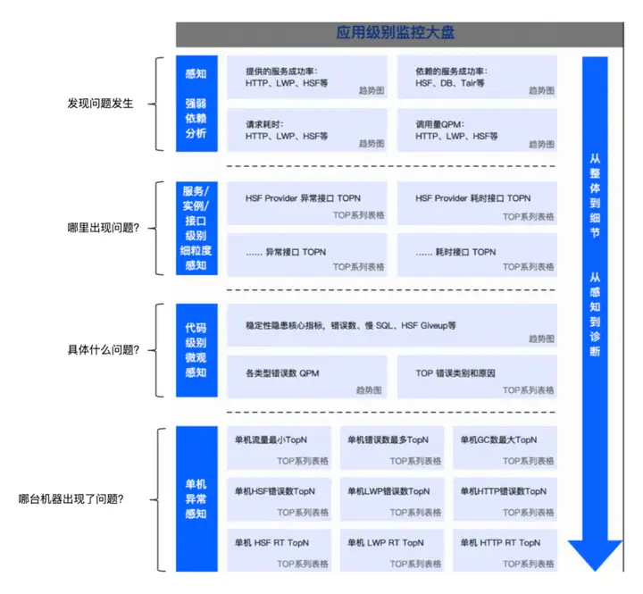 除了数据对账监控,另一个重要手段就是日志监控。加日志监控的时候通常会面临一个状况,就是加了监控也很难定位到问题。所以我们需要一个方法不仅可以发现问题发生,还能定位到具体是哪里出现问题,具体什么问题,甚至在多机器应用到底是哪台除了问题。这里我们借鉴了一位大佬的方法论,配置了一套从整体到细节,从感知到诊断的系统统一监控,可以很好的解决上面提到的问题。↓↓↓↓↓