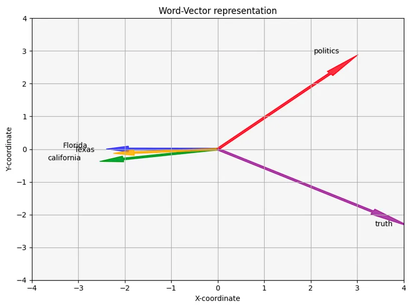 假设我们将下面这5个单词转换为嵌入表征:“florida”, “california”, “texas”, “politics”和“truth”。由于嵌入(embeddings)只是由数字组成的数组,我们可以将其绘制在图表上。但是,由于它们的维度(用于表示单词的数字数量)很高,可以轻松达到 100 到 1000,因此我们无法将它们原封不动地绘制出来。我们无法在2维的计算机/手机屏幕上绘制一个100维的向量。此外,人脑很难理解超过3维的东西。4维向量是什么样子的?我不知道。