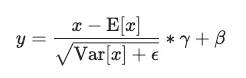 (x - mean(x)) / sqrt(variance(x) + epsilon) * gamma + beta