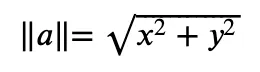 符号 ||a|| 表示向量 "a" 的大小,它表示从原点(点 0,0)到向量顶端的距离。计算向量大小的公式如下: