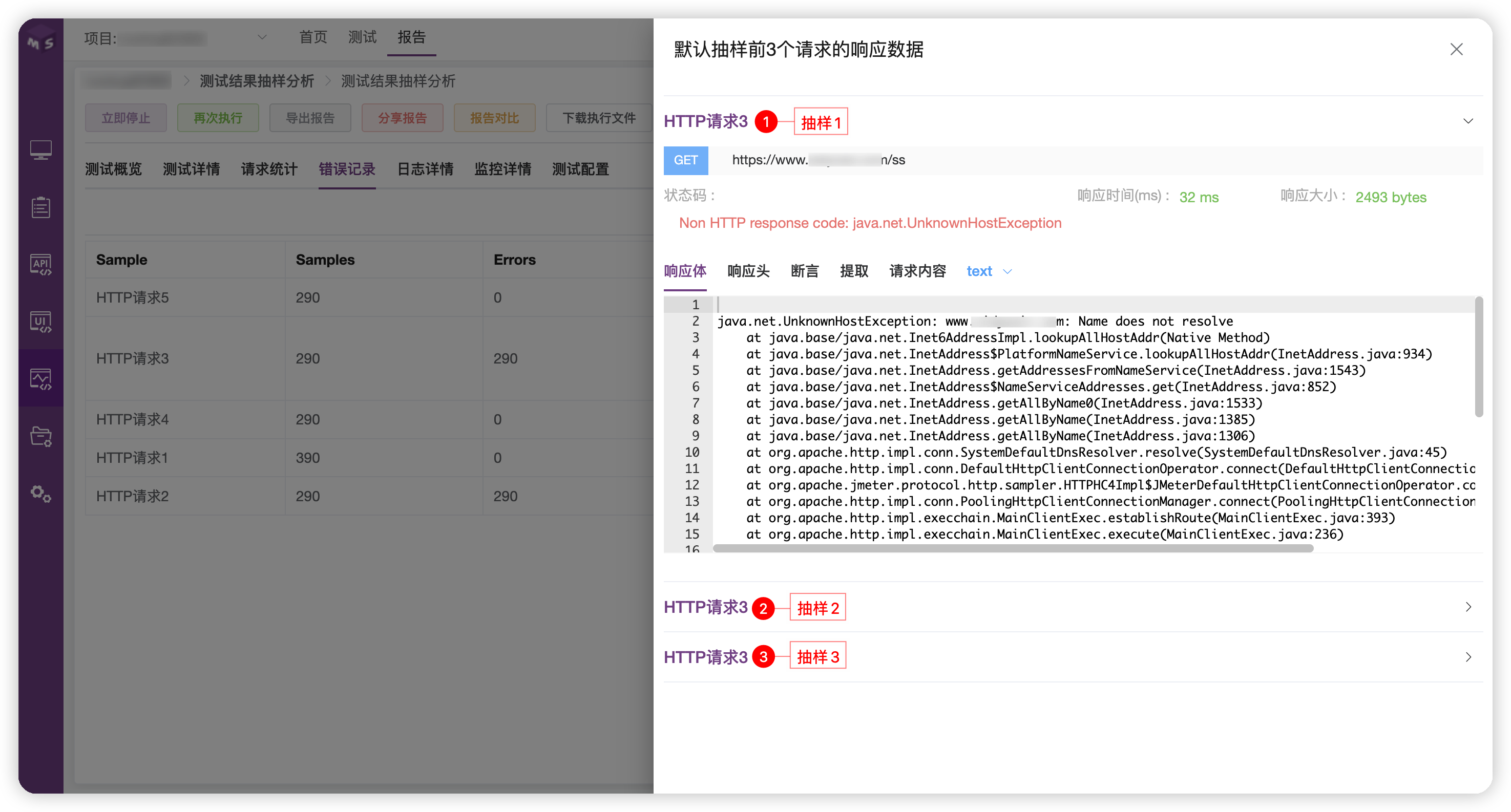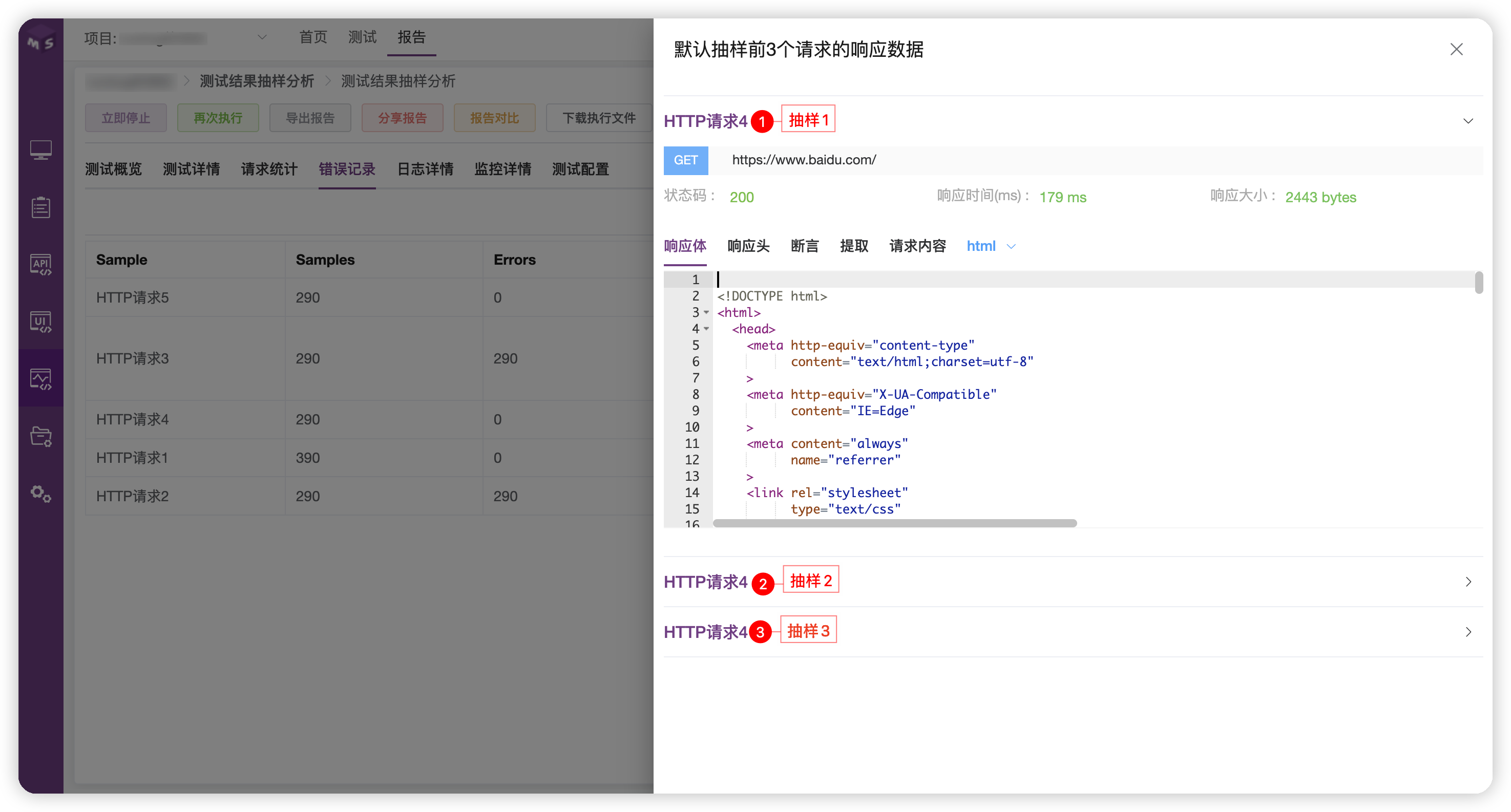 新版MeterSphere提供性能测试的全部请求和错误请求的前三个抽样详情,包括请求的发起时间、响应时间、吞吐量、错误率等指标,方便用户开展性能分析、异常检测和问题排查。通过抽样分析,用户可以有效地捕捉到性能测试中的潜在问题和异常情况。