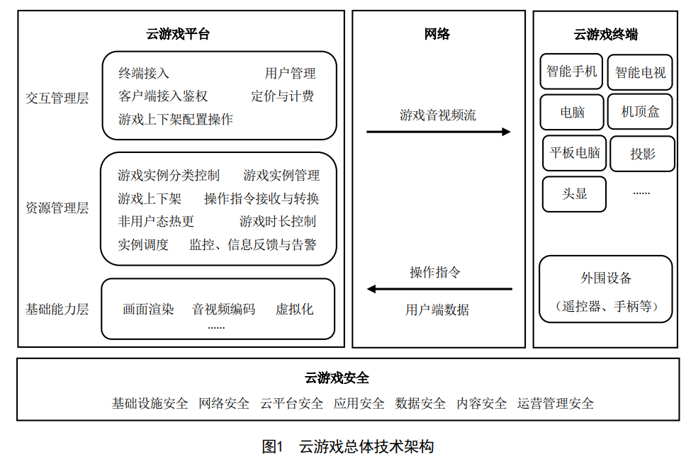 云游戏总体技术架构包括云游戏平台、网络、云游戏终端和云游戏安全四个部分: