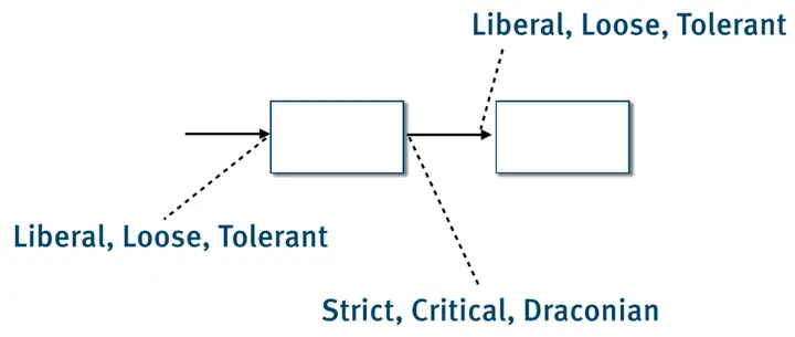 这条原则最早是 Jon Postel 在 TCP 协议中描述的,当计算机之间通过协议通讯的时候, 对于其他计算机发送给自己的内容,要考虑各种异常、不规范的情况,即要主动消化各种复杂度;而当自己给其他计算机发送内容的时候,则要有严谨的 Spec,并且严苛地遵守 Spec。