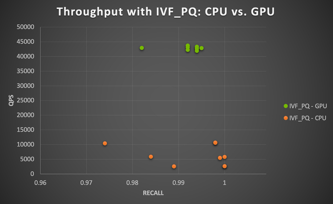此外,图 5 显示了在 CPU 和 GPU 上使用 IVF_PQ 测试的所有参数组合的召回率-QPS tradeoff。该图中每个点(上为GPU,下为 CPU)展示了在改变向量索引/查询参数时召回率和吞吐量的 tradeoff:更高召回率的代价是较低吞吐量。注意,在使用 GPU 的情况下,提高召回率时,QPS 会大幅降低。