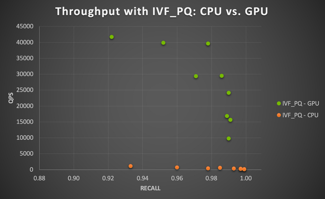 图 5|在 CPU和 GPU 上使用 IVF_PQ 进行测试的参数组合及其召回率-吞吐量tradeoff(User vs. User)。