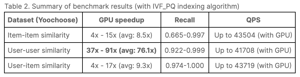 对于更大的第二个数据集(730 万个用户),我们将 85%(约 620万个)的向量用于“训练”(要建立索引的向量集),剩下的 15%(约 110 万个)作为“测试”或查询向量集。在这种情况下,HNSW 和 IVF_PQ 表现非常出色,召回率分别为 0.884-1.0 和 0.922-0.999。然而,它们在计算上要求更高,尤其是在 CPU 上使用 IVF_PQ 的情况。使用 HNSW 在 CPU 上执行所有查询的总时间范围为 279.89 至 295.56 秒,而使用 IVF_PQ 的总时间范围为 3082.67 至 10932.33 秒。注意,这些查询时间是对 110 万个向量进行查询的累积时间,因此可以说针对索引的单个查询仍然非常快。然而,如果推理服务器要对数百万个商品并发请求运行查询,不推荐使用 CPU 查询。