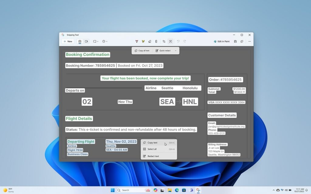 - 更智能的截图功能:使用Windows 11附带的截图应用,你可以从截图中复制文本,并快速编辑电子邮件或电话号码。