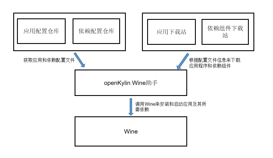 - openKylin Wine助手首先从应用配置仓库和依赖配置仓库下载配置文件。随后,将应用程序展示在窗口中,当用户点击应用程序后面的安装按钮,openKylin Wine助手就会根据配置信息下载相应用的应用程序和依赖,并最终调用Wine进行安装。