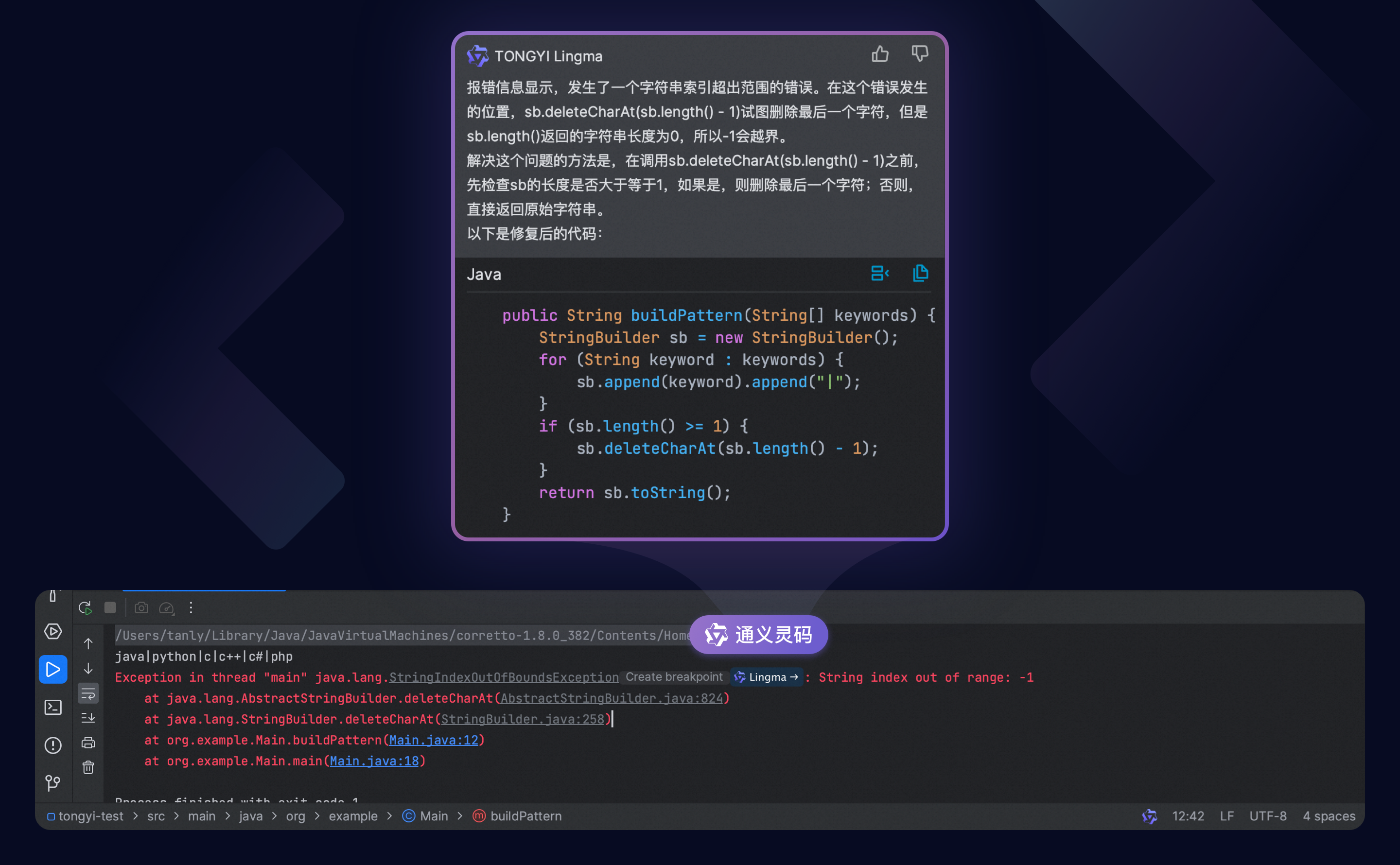 当运行出现异常报错时,一键启动报错排查的智能答疑,可结合运行代码、异常堆栈等报错上下文,快速给出排查思路或修复建议代码。