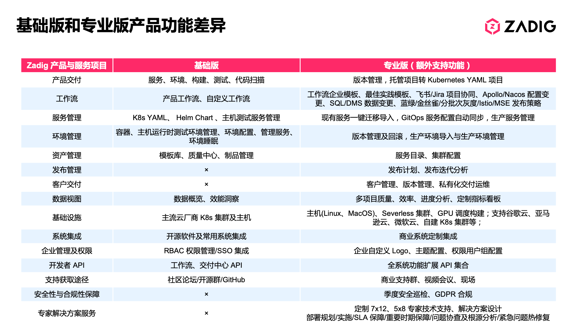从源代码层面上,本次产品合并以开源 Zadig v1.18.0(最新版) 为基础,合并了原 ZadigX v1.8.0(即企业版)全部新功能代码,统称为 Zadig,产品版本正式定义为 Zadig v2.0.0,同时服务端代码在 GitHub 上全部开源,产品功能差异通过授权区分基础版和专业版。