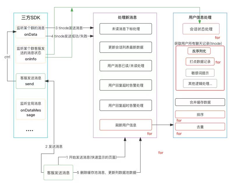 上面我们讲到消息排序、去重以及消息状态更新等等,多个会话大量的聊天消息,如果处理不当,卡顿是必现的,可以先看一下我们优化之前的处理流程,采用的是第三方的SDK,一堆for循环,消息量大一些基本卡住没反应了。