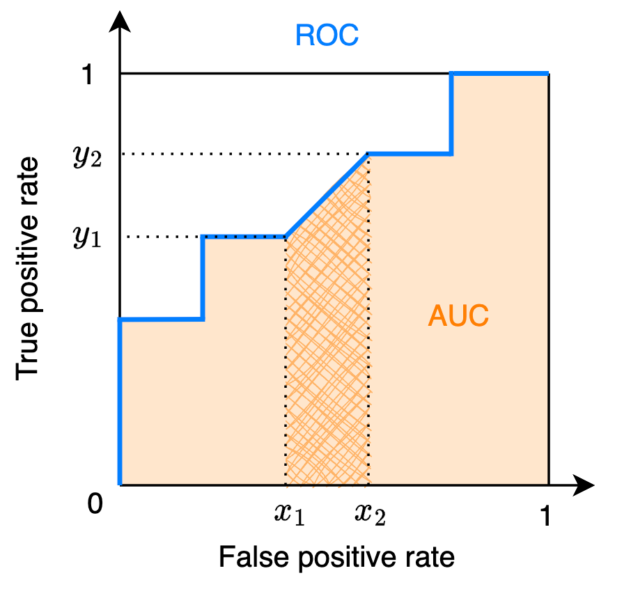 由 AUC 名称可知,可以先计算 ROC 曲线,得到 TPR 和 FPR 的坐标后再分段计算面积即可得到 AUC