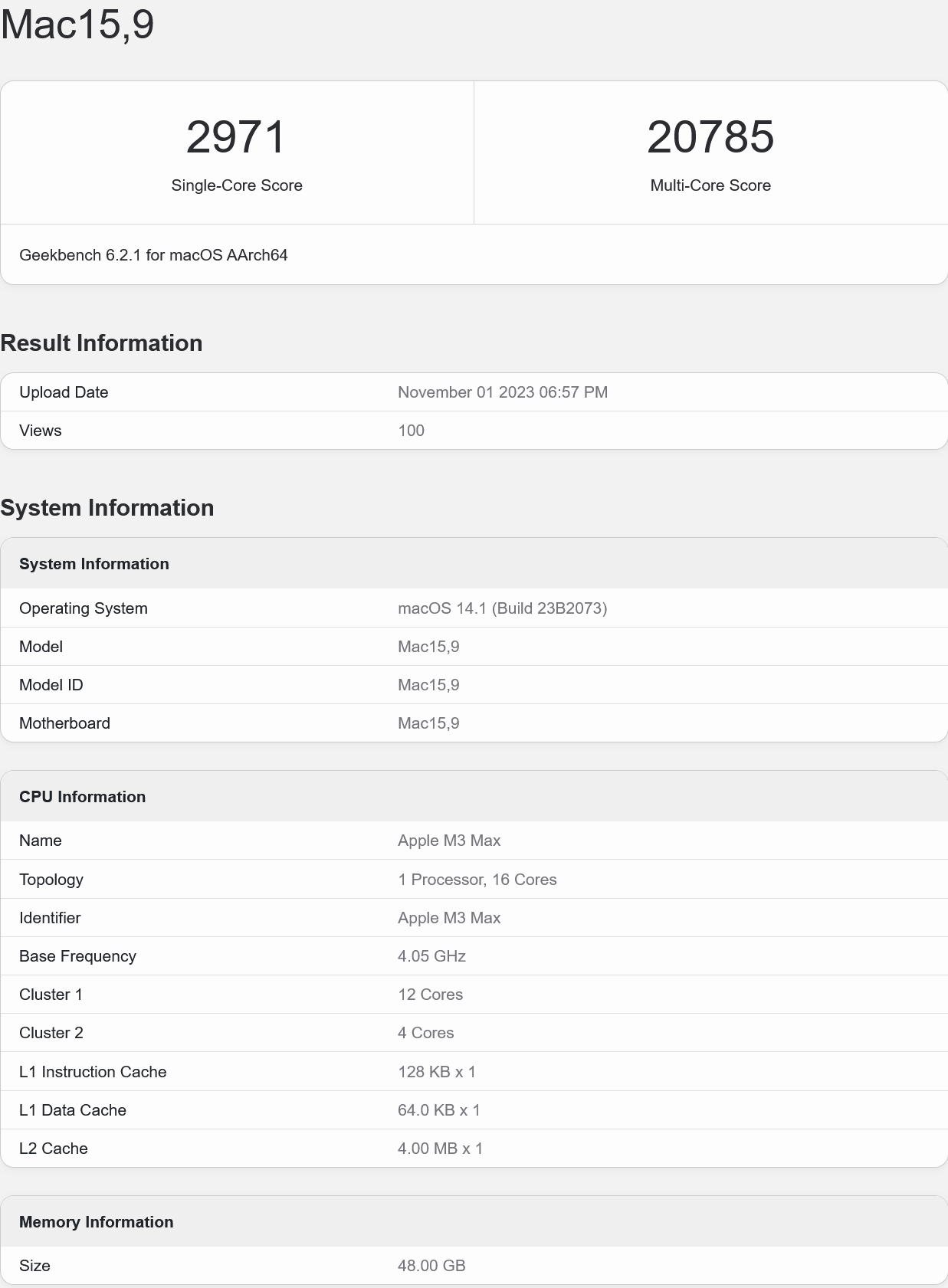 在 GeekBench 跑分库上,搭载 M3 Max 芯片的设备标识符为 Mac15,9,目前共有 4 条信息,其中一条单核成绩跑分为 2943 分,多核为 21084 分。
