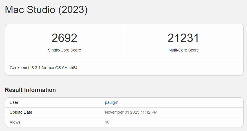 作为对比,目前 Geekbench 中收录的 Mac 单核最高分为 Mac Studio (2023) 的 2803 分(M2 Max),多核为 21316 分(M2 Ultra)。