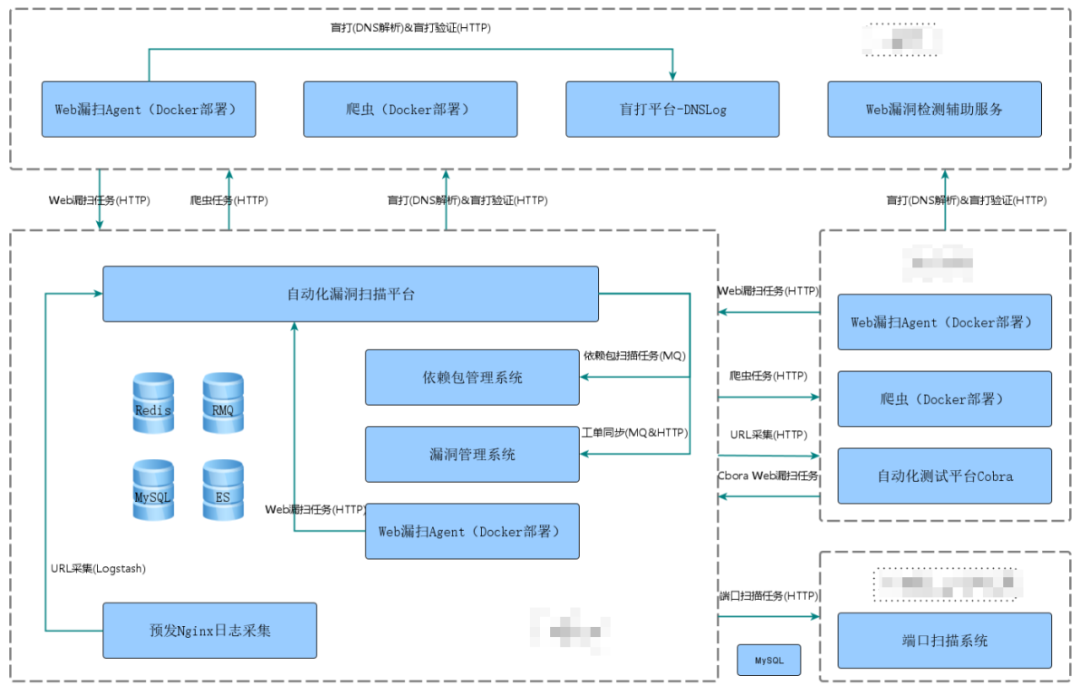 该系统架构的核心功能点包括:资产收集、Web漏洞扫描、依赖包扫描、端口扫描,辅助功能包括:扫描任务管理、风险管理等。