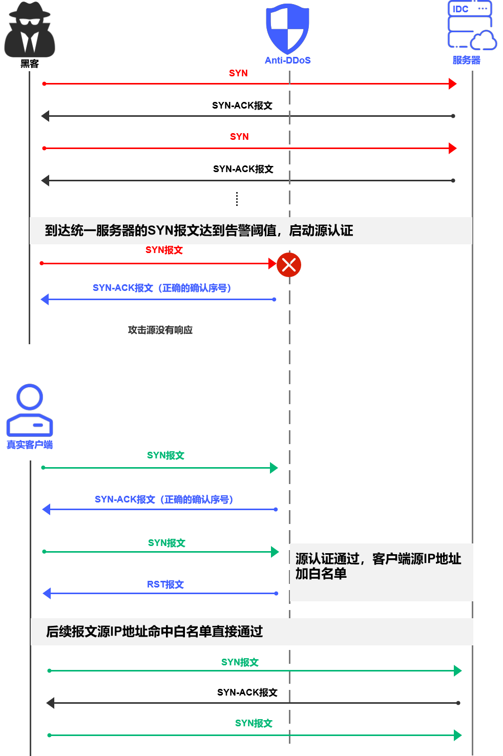 如果这个源是真实客户端,则会向服务器发送ACK报文,对收到的SYN-ACK报文进行确认。抗DDoS设备收到ACK报文后,将该客户端的源IP地址加入白名单。同时,抗DDoS设备会向客户端发送RST报文,要求重新建立连接;