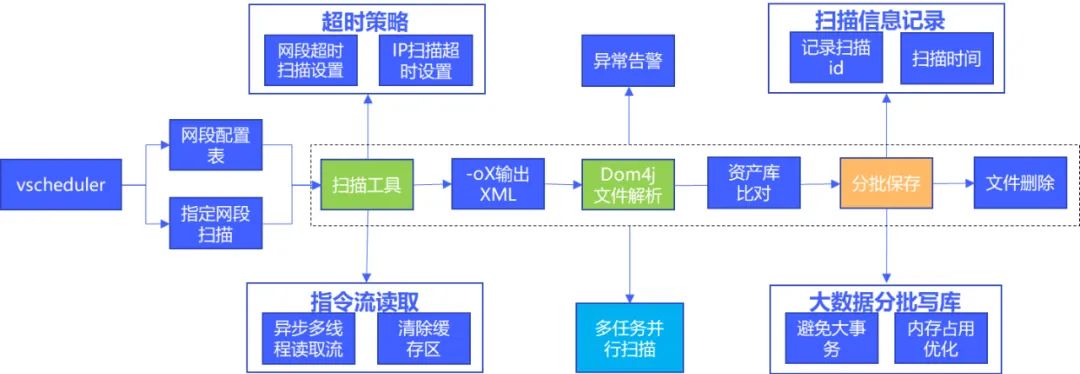 使用网络发现工具进行异常端口识别,设计思路是首先通过vscheduler中间件触发扫描(支持两种模式:一网段配置表全表网段扫描、二是:指定网段扫描。),调用扫描工具(以nmap为例)进行扫描,通过增加两个异步线程去读取缓冲区内容以解决缓冲区拥塞问题,通过异步线程进行缓冲区内容读取以及清理的同时通过错误缓冲区内容判断是否扫描失败。扫描结果输出xml后通过dom4j进行解析,再进行分批保存,避免大事务以及减少jvm内存占用。最后把文件删除,释放存储空间。