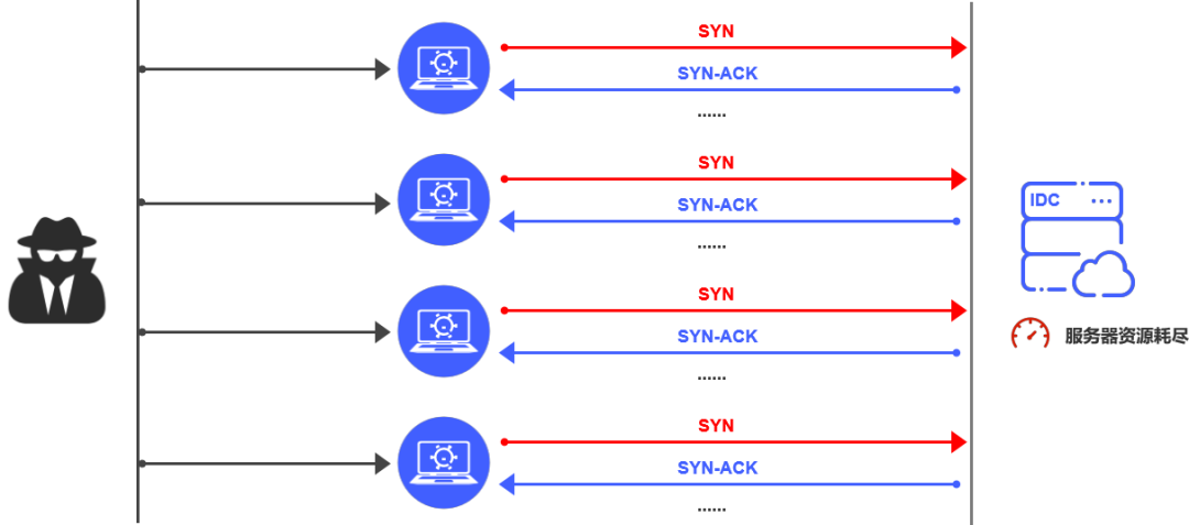 攻击者伪造源IP地址向服务器发送大量的SYN报文,请求建立三次握手。由于发送源IP是伪造的,所以服务器回应了SYN-ACK报文后,源IP并不会再继续回应ACK报文进行确认。这样服务器就会维持一个庞大的等待列表,不停地重试发送SYN-ACK报文,同时占用着大量的资源无法释放。这就导致,被攻击的服务器被恶意半连接占满,不再接受新的SYN请求,而合法用户无法完成三次握手建立TCP连接。另外,随着对抗技术的持续演进,攻击者通过肉鸡或Ddos服务发起大规模分布式真实IP集中进行资源耗尽攻击,此类攻击成功率更高。