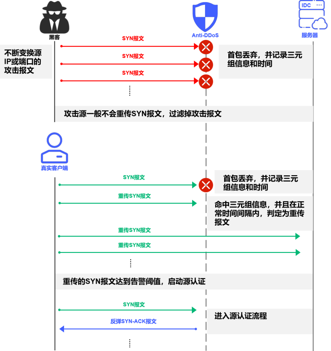 首包丢弃功能就是利用了TCP的超时重传机制,Anti-DDoS系统对收到的第一个SYN报文直接丢弃,然后观察客户端是否重传。如果客户端重传了SYN报文,再对重传的SYN报文进行源认证,即反弹SYN-ACK报文,这样就可以大大减少反弹报文的数量。