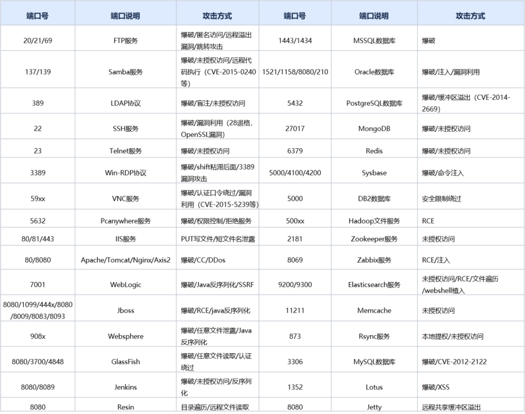 往往服务器系统本身或引入的应用服务就具备一定的脆弱性,攻击者获取到目标服务器的端口列表后会逐一去比对自己的武器库进行漏洞利用尝试。