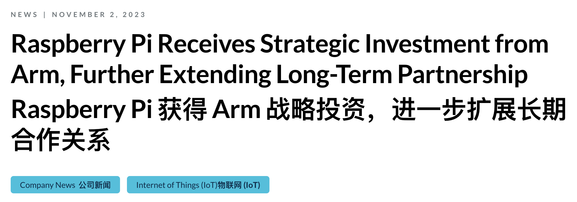 Arm 宣布已对树莓派 (Raspberry Pi) 进行战略投资,并收购了后者的少部分股权,进一步扩大两家公司之间的长期合作伙伴关系,携手为物联网开发者社区提供关键解决方案。