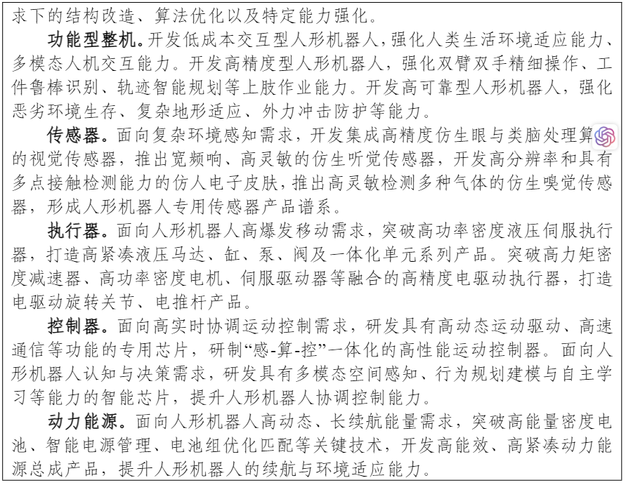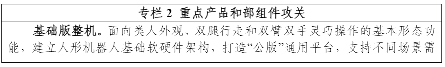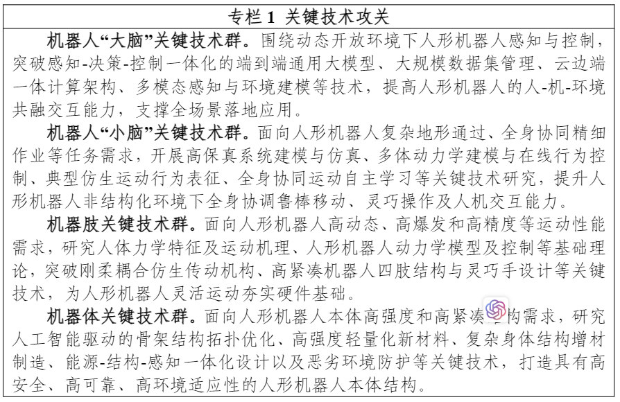 在人形机器人“关键技术”方面,实现“大脑、小脑、肢体”等一批关键技术的突破,构建完善人形机器人制造业技术创新体系。