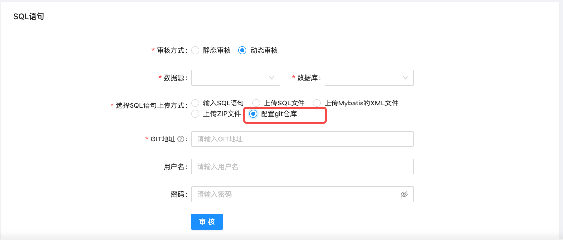 在使用 SQL审核 时,如果使用的 SQL 来源是 Git 仓库,则 SQLE 会从 Git 仓库里的 Java 代码中提取 SQL 并进行审核。以下是简单的试用: