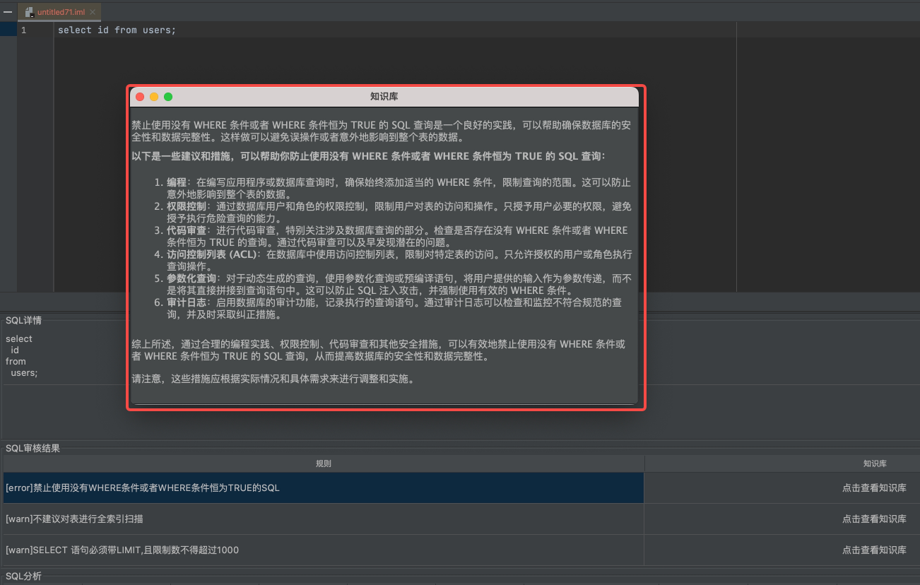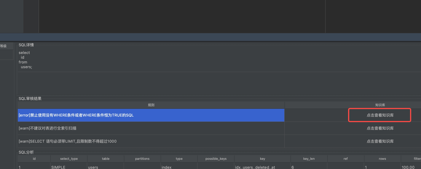 使用 SQLE 插件审核 SQL,在审核结果中点击新增的“点击查看知识库”。