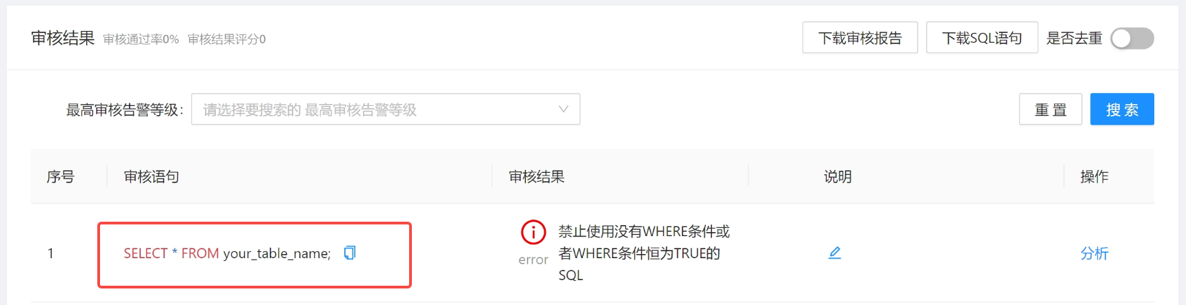 1. 输入 SQL 后,点击 SQL审核 图标,对编写的 SQL 进行规则审核,获取优化建议;