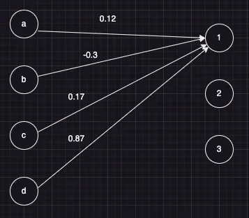 前馈全连接层(feed-forward linear layer)基本上就是一堆神经元,每个神经元都与其他神经元相连接。请看下图,其中a、b、c和d是神经元。这些神经元包含了一些 input(即一些我们想要理解的数据(像素值(pixels)、词嵌入(word embeddings)等))。它们与编号为1的神经元相连。每两个神经元之间的连接都有不同的连接权重值(connection strength)。例如,a-1是0.12,b-1是-0.3,等等。实际上,左列中的所有神经元都与右列中的所有神经元相连。但是为了清晰起见,我没有在图像中展示全部的连接,你需要了解这一情况。就像图中有a-1一样,还应该有a-2、b-2、c-2、d-3等。两个神经元之间的每个连接都有不同的“连接权重”。