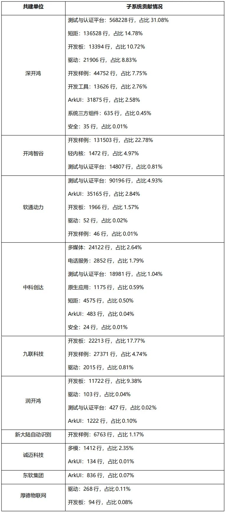 华为的贡献覆盖30多个核心子系统,其他顶级共建单位在各领域的贡献情况如下:
