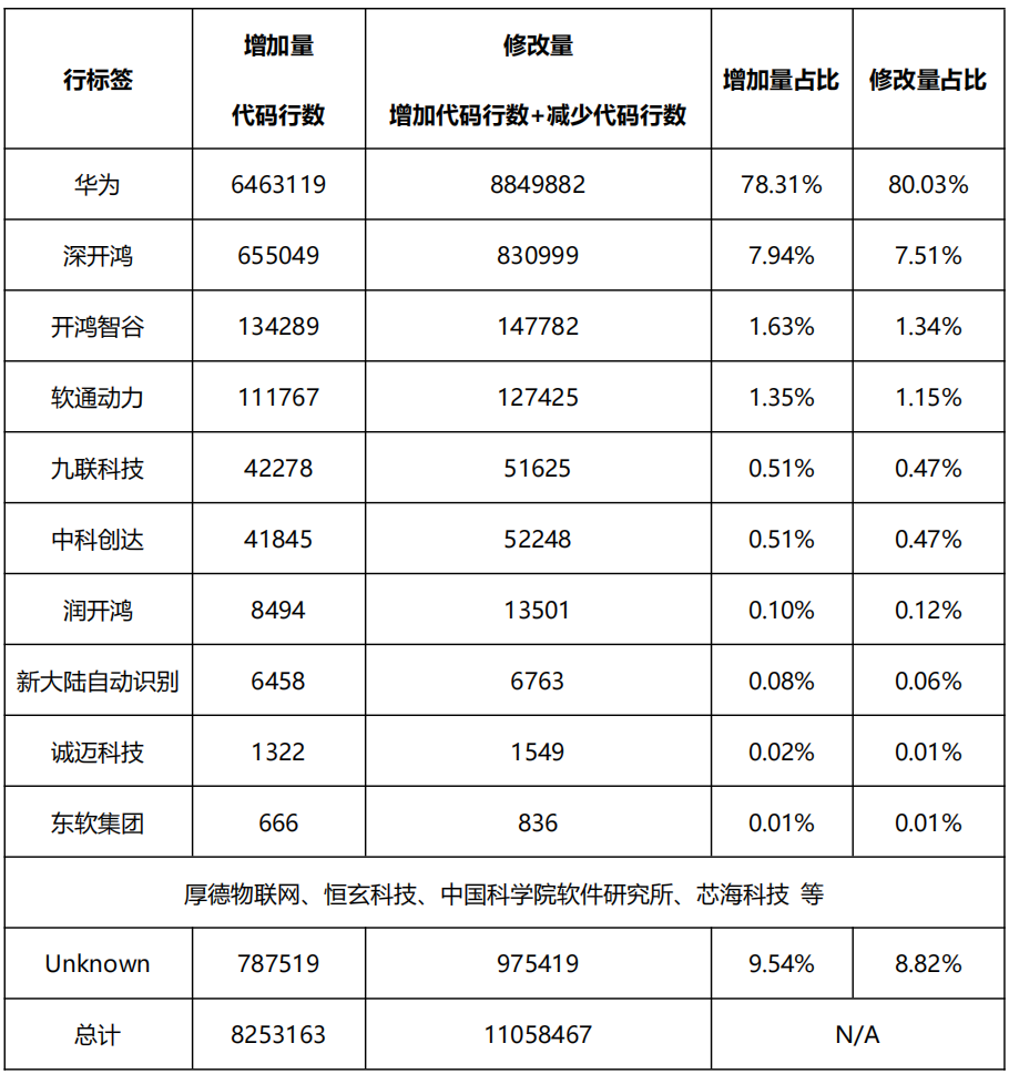 据称华为、深开鸿、软通动力、开鸿智谷分别建设超过5万+行代码并持续贡献中,成为2023年《百人代码贡献单位》。九联开鸿、润开鸿、京东、诚迈科技、中科院软件所、中软国际持续贡献中,计划今年12月31日前贡献5万+行功能特性代码。
