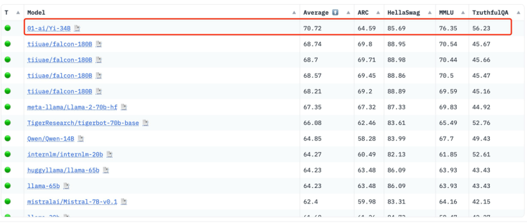 Hugging Face Open LLM Leaderboard (pretrained) 大模型排行榜,Yi-34B高居榜首(2023 年 11 月 5 日)