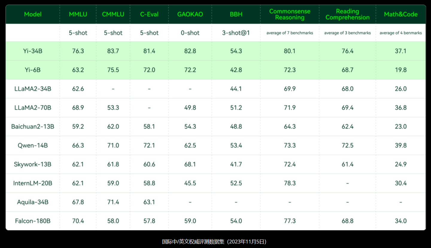 - 中文综合能力:在CMMLU、E-Eval、Gaokao等中文评测指标上,Yi-34B明显领先于GPT-4,展现了其在中文语境下的强大理解和应用能力。
